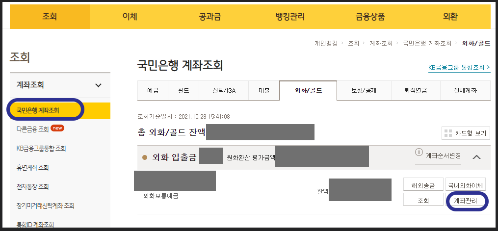 ● 국민은행 로그인 → 국민은행 계좌조회 → 외화/골드 → 계좌관리