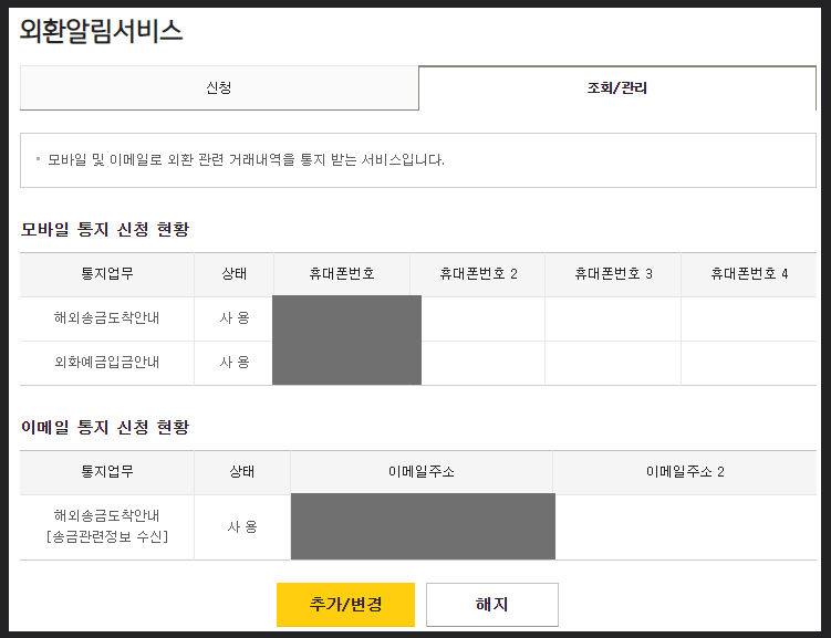 아까는 신청 탭에서 진행했는데 이제 오른쪽의 <조회/관리> 탭을 누르면 됩니다. 여기에는 <모바일 통지 신청 현황>과 <이메일 통지 신청 현황>에 대한 리스트를 확인할 수 있습니다. 저는 2가지 통지업무를 선택했는데 바로 해외송금 도착안내와 외화예금입금 안내를 신청했습니다.