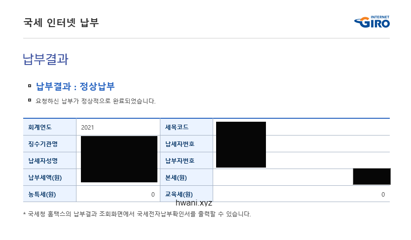 <국세 인터넷 납부>라는 창이 새롭게 보이면서 납부결과라는 내용이 나옵니다. 저처럼 <납부결과 : 정상 납부>로 표시되어 있다면 제대로 납부한 게 맞습니다. 작게 "요청하신 납부가 정상적으로 완료되었습니다."라는 안내문구도 함께 보입니다.