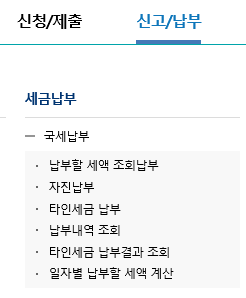 2. 상단 메뉴에서 <신고/납부 - 국세 납부 - 납부할 세액 조회 납부>로 들어가 납부해야 할 세금 조회를 해본다.