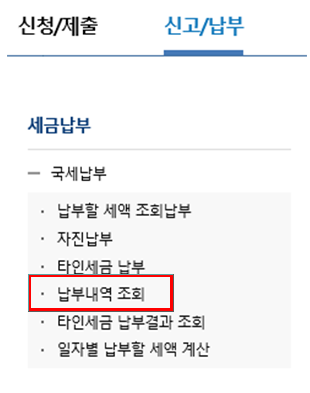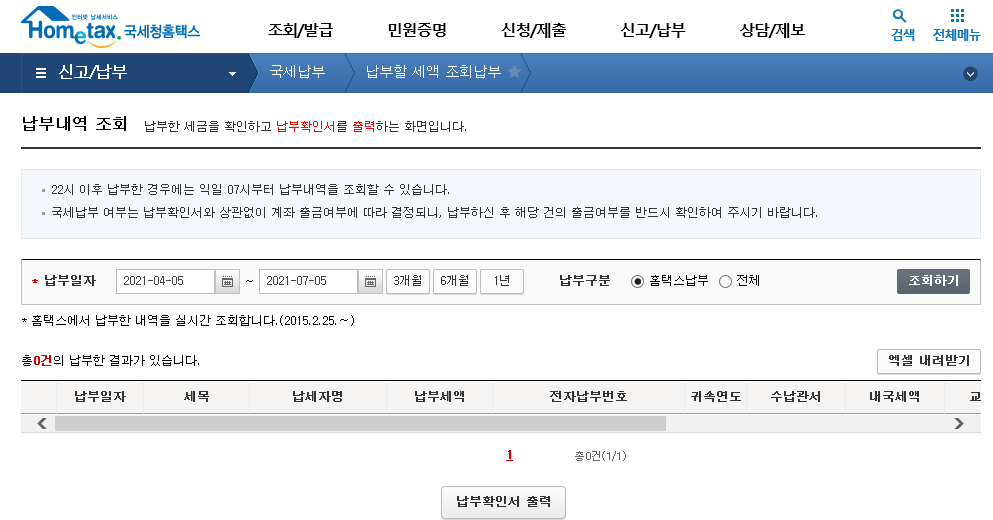 홈택스 메인에서 <신고/납부>-<국세 납부>-<납부내역> 조회로 들어가면 마찬가지로 납부일자를 조회하여 납부한 내역을 확인할 수 있고 원하는 납부내역에 대해서는 납부확인서 출력도 가능합니다.