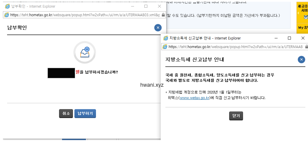 그랬더니 팝업이 2가지가 뜨는데요. 먼저 오른쪽에 '지방소득세 신고납부 안내'에 대한 내용은 지방소득세의 경우에는 홈택스가 아닌 위택스에서 직접 신고 납부하라는 안내 창입니다. 그러니 더 신경 쓸 것 없이 닫기를 누르시면 됩니다.