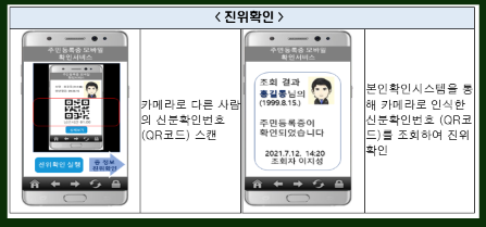 '주민등록증 모바일 확인서비스'는 '정부 24'를 통해 본인 확인 절차를 거치게 되며, 신분확인번호(QR코드)를 수신하여 주민등록증 수록 사항을 화면에 표시 또는 스캔하여 타인의 주민등록증 진위여부를 확인하는 방식으로 이용하게 됩니다.