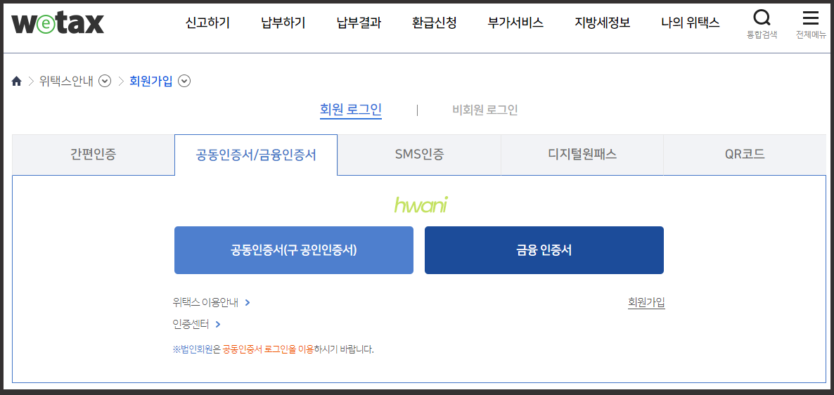 법인회원은 공동인증서를 통해 로그인을 이용해야 합니다.