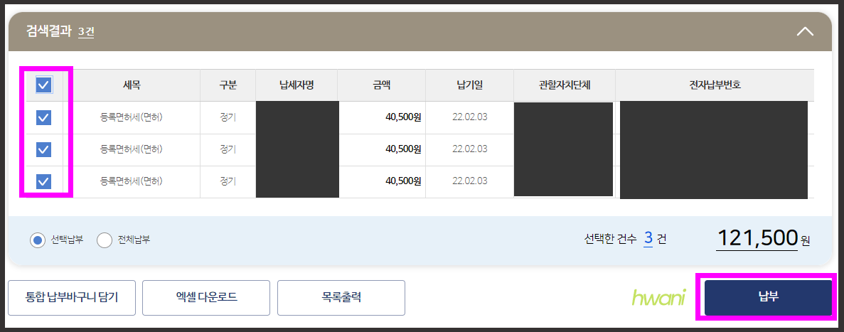 저는 등록면허세 3가지를 모두 한꺼번에 납부하기 위해 체크박스에 모두 체크를 눌렀습니다. 각 40,500원의 등록면허세 3가지를 한꺼번에 납부하게 되면 총 121,500원을 납부해야 합니다.