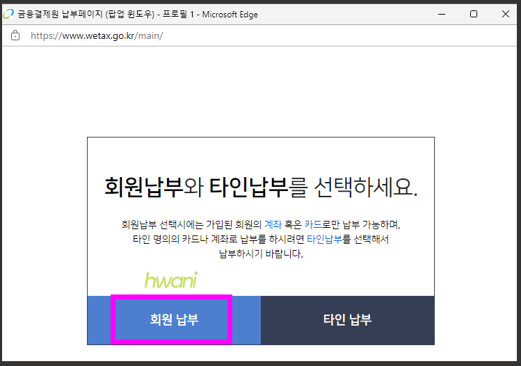 그다음 회원납부를 할 것인지 타인납부를 할 것인지 선택하면 됩니다.