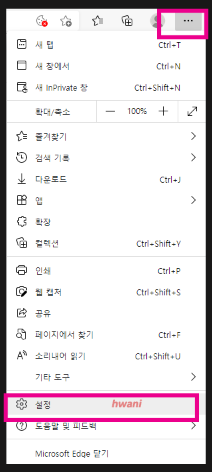 1. 마이크로소프트 엣지 브라우저를 연 다음 오른쪽 상단 점 3개를 클릭! 그리고 설정으로 들어간다.