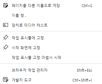 *브라우저에서 점3개를 눌러 메뉴를 확인해보자. 새 탭, 새창에서, 새 inprivate창, 확대 및 축소, 즐겨찾기, 검색기록, 다운로드, 앱, 확장, 컬렉션, 인쇄, 웹 캡처, 공유, 페이지에서 찾기, 소리 내어 읽기, 기타 도구, 설정, 도움말 및 피드백, 마이크로소프트 엣지 닫기가 있다.