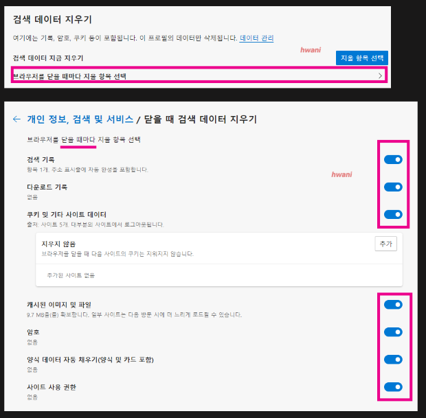 <브라우저를 닫을 때마다 지울 항목>을 선택할 수 있는데 항목은 총 7가지가 있다. 검색 기록, 다운로드 기록, 쿠키 및 기타 사이트 데이터, 캐시 된 이미지 및 파일, 암호, 양식 데이터 자동 채우기, 사이트 사용 권한에 대해서 브라우저를 닫을 때마다 지우고 싶은 항목을 파란색으로 활성화시켜놓으면 된다.
