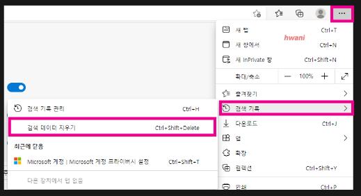 설정으로 들어간 뒤 찾는 방법보다 더 간단한 방법은 따로 있다. 점3개에서 설정을 누르지 말고 [검색 기록]에 마우스를 놓아보자. 그러면 검색 기록 관리라는 항목과 [검색 데이터 지우기] 항목이 보인다. 여기서 검색 데이터 지우기를 누르면 바로 시간 및 항목을 선택할 수 있는 팝업이 나온다.