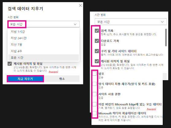 지울 항목 선택을 누르고 나면 팝업창이 뜬다. 여기에서 [검색 데이터 지우기 - 시간 범위]를 설정할 수 있다. 시간 범위는 모든시간, 지난 4주, 지난 7일, 지난 24시간, 지난 1시간으로 범위를 선택할 수 있는데, 모든 내용을 삭제하길 원한다면 [모든 시간]을 선택하면 된다.