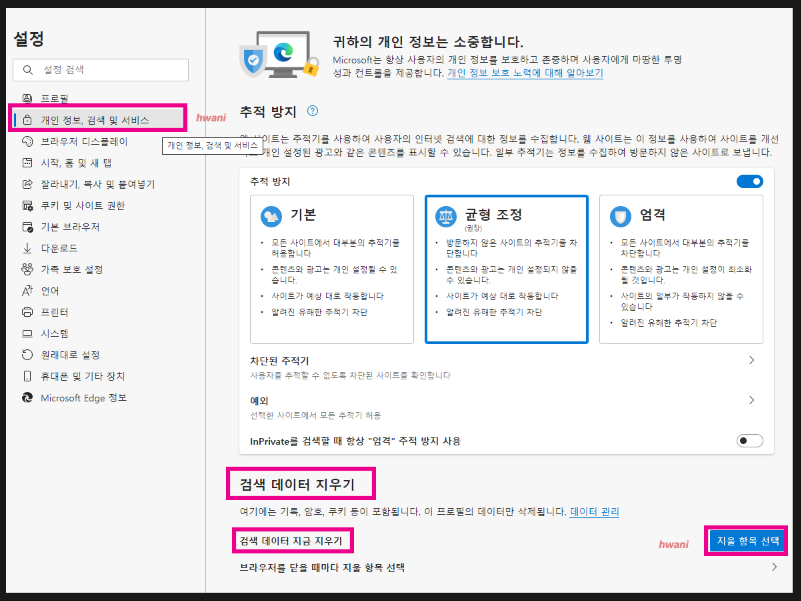 설정을 누르면 왼쪽에 여러가지 메뉴가 보인다. 두 번째에 있는 개인정보, 검색 및 서비스를 누르면 오른쪽에 해당 내용을 설정할 수 있는 화면이 나오는데 추적 방지 아래의 [검색 데이터 지우기]를 찾으면 된다. 검색 데이터 지우기에서 [지울 항목 선택] 버튼을 찾은 뒤 누르면 된다.