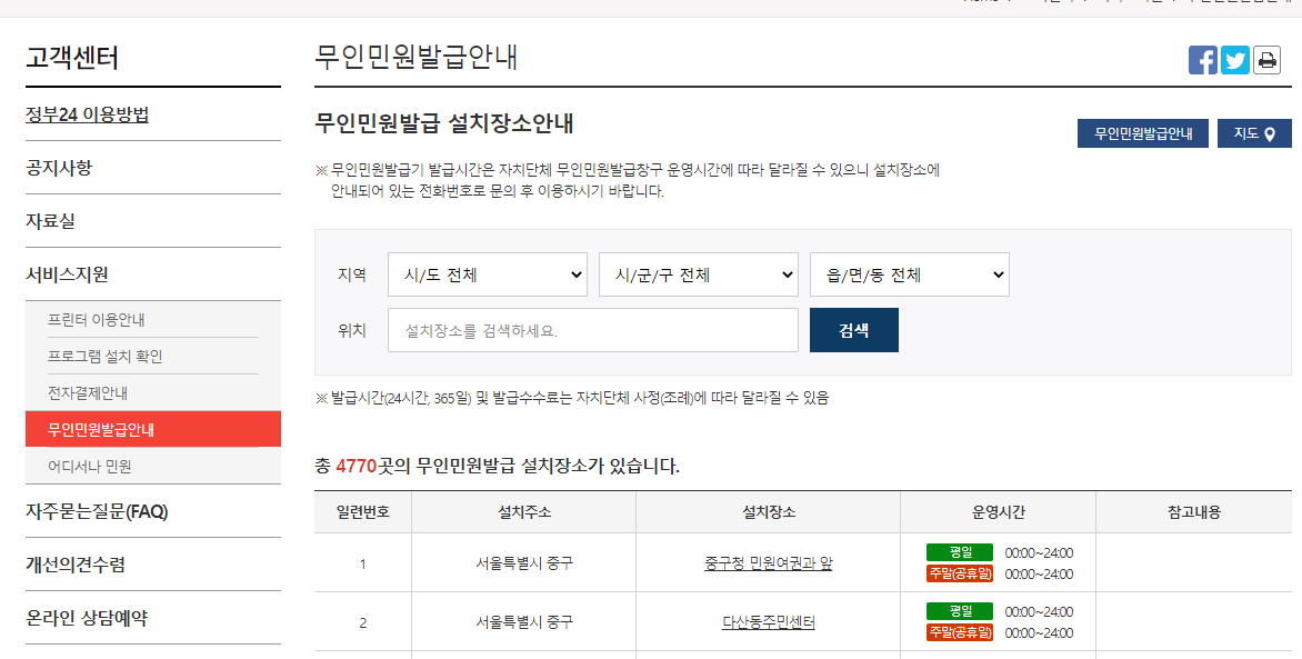 정부 24 사이트 → 고객센터 → 서비스 지원 → 무인민원발급기 안내 → 설치장소 확인