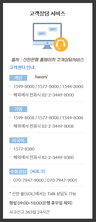 신한은행 고객센터 전화번호 ARS 원격지원 상담 - 개인 기업 외국어 수화상담 대표번호