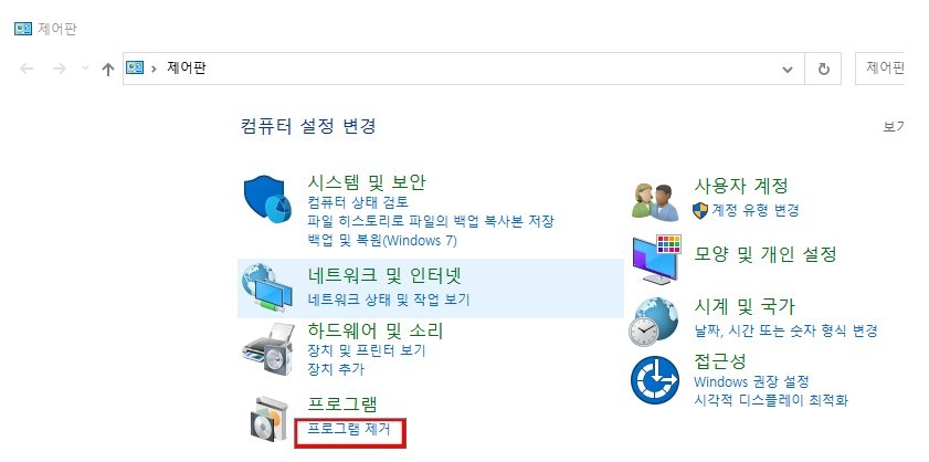 하단에 검색에서 제어판을 칩니다. 그러면 제어판을 열 수 있게 나옵니다. 제어판을 열고 나면 <컴퓨터 설정 변경>이라고 여러 가지가 나오는데 그중에서 <프로그램>으로 들어갑니다. 프로그램에는 <프로그램 제거>라고도 되어있습니다. 그걸 눌러주세요.