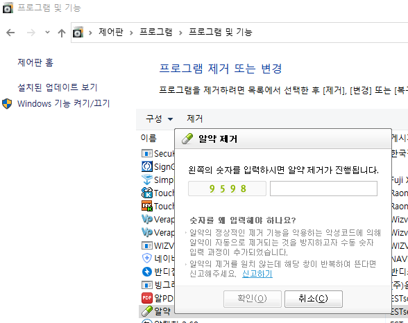 제거-제거 두번이나 눌렀는데도 아무런 반응이 없습니다............ 윈도우 설정에서 앱 및 기능으로 들어가서는 알약이 지워지지가 않았습니다... 알약 지우기 참 어렵네요.