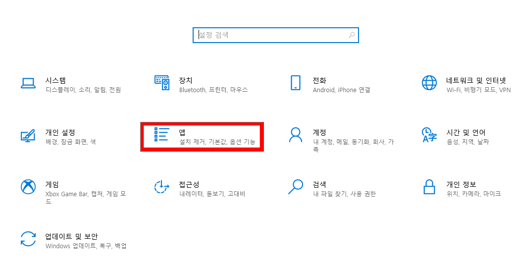 윈도우에서 설정을 누르면 여러 가지 설정 가능한 내용들이 나오는데요. 여기서 앱을 보면 설치 제거, 기본값, 옵션 기능이라는 소개와 함께 보입니다. 앱을 눌러보세요.