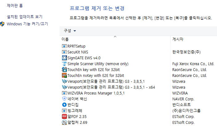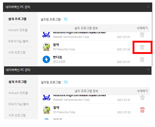 1. 네이버 백신 - PC관리에서 프로그램 삭제 가능 (그러나 알약은 지우지 못했음)