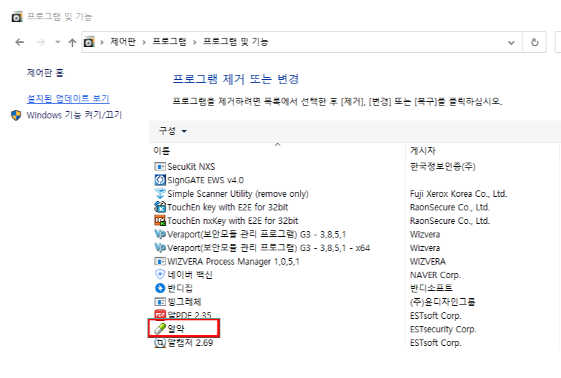 저처럼 다른 백신프로그램을 통해 알약을 지우다가 실패하셨거나, 윈도우 설정에서 앱으로 들어가서 지우려다 실패하신 경우 윈도우 제어판에서 프로그램 제거로 들어가 알약을 제대로 지우시길 바랍니다!