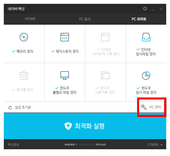 먼저 네이버 백신에서 알약을 지우는 시도를 했습니다. 네이버 백신을 실행시키고 PC최적화로 들어가면 하단에 PC관리라는 글자가 보입니다. PC관리를 누르면 설치된 프로그램들이 보이고 여기서 프로그램을 삭제할 수 있습니다.