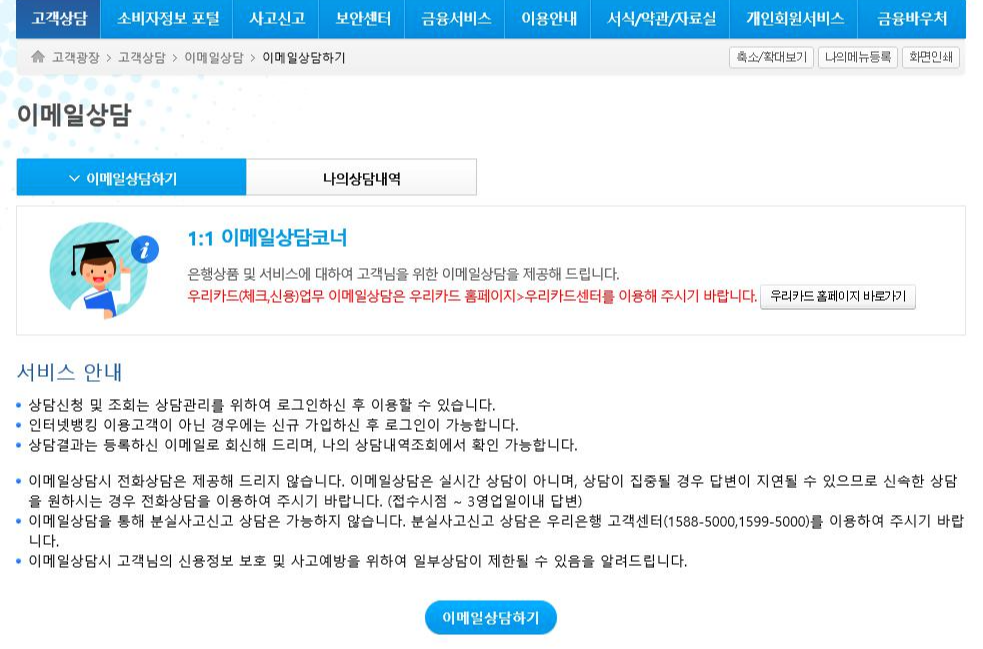 이렇게 우리은행에 문의를 할 때에는 전화상담말고도 이메일상담을 신청할 수 있습니다. 이메일상담하기 페이지로 들어오니 서비스 안내가 보입니다.