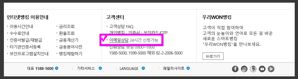 우리은행에 로그인을 한 뒤 홈페이지의 하단으로 가보세요. 그러면 고객센터에 <이메일 상담>이라는 글자가 보입니다. 이메일 상담을 누르면 상담할 수 있는 페이지로 바로 연결됩니다.