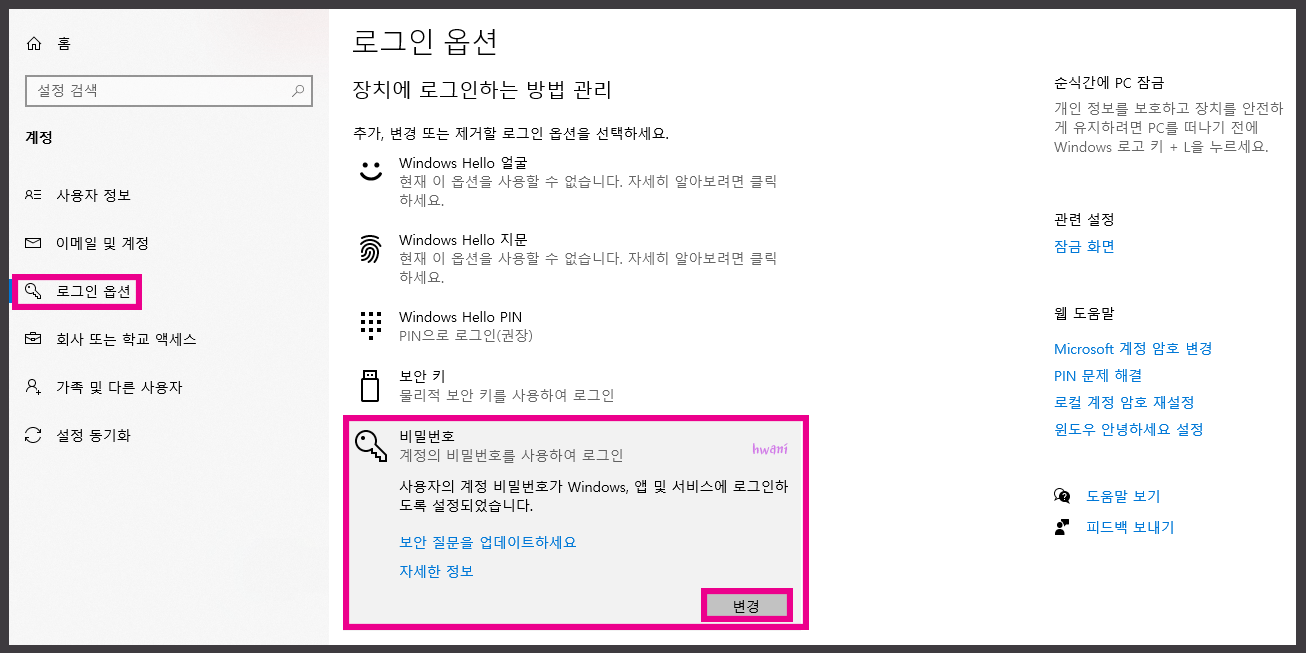 로그인 옵션 중에서 비밀번호를 눌러주세요. 저는 비밀번호가 이미 설정되어 있는 상태이기 때문에 변경으로 표시되어 있습니다. 비밀번호가 설정되지 않은 상태라면 [추가]라는 버튼을 볼 수 있습니다.