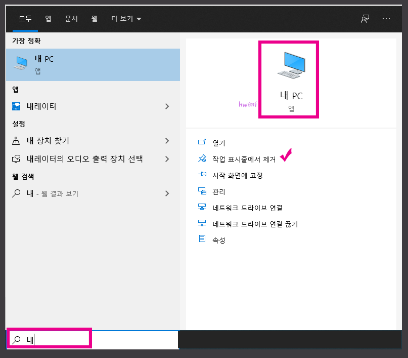 *내 PC를 매번 찾기 번거롭다면, 작업표시줄에 표시하도록 설정하는 방법도 있습니다. 저는 작업표시줄에 내 PC를 넣어두어서 <작업 표시줄에서 제거>라고 보이네요. [내 PC]를 편하게 사용하려면 작업 표시줄에 고정하거나 시작화면에 고정하는 방법이 있으니 참고하세요.