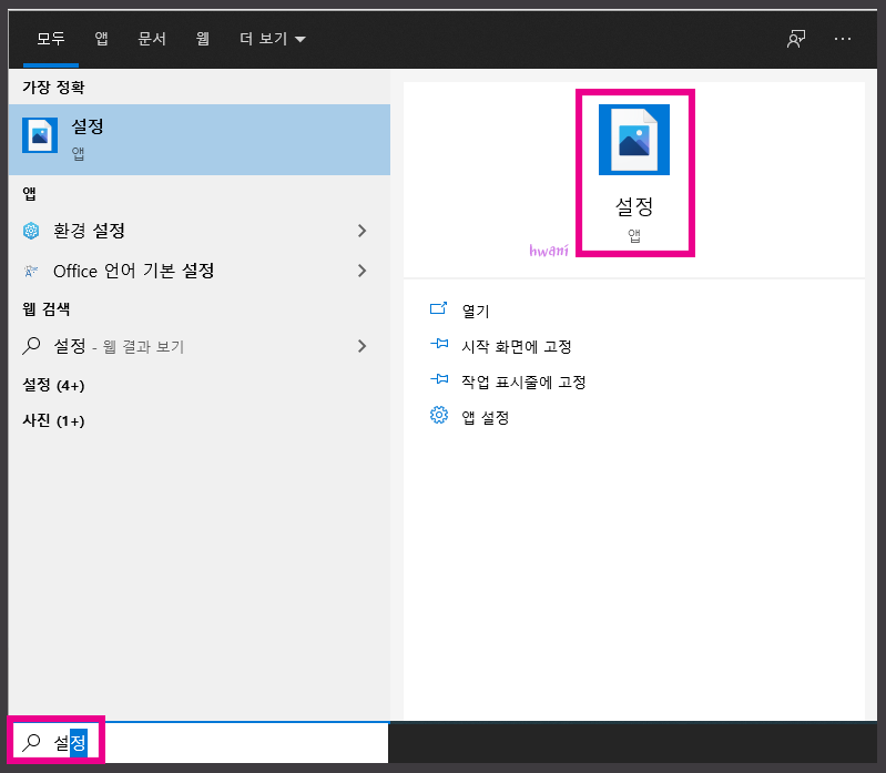 사실 [설정] 메뉴만 사용할 거라면 더 쉬운 방법이 있습니다. 윈도우10 검색창에서 [설정]이라고만 검색하면 바로 나옵니다.