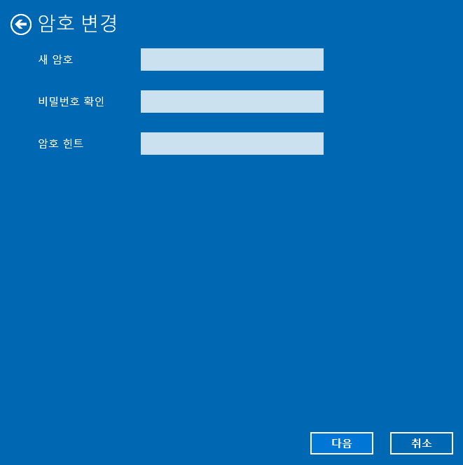 ● 이미 비밀번호가 설정되어 있는 상태 : [변경] 버튼을 누르면 비밀번호를 변경 혹은 비밀번호 설정을 없앨 수 있다. 비밀번호 설정을 해제하려면 <암호 변경> 화면에서 새 암호, 비밀번호 확인, 암호 힌트를 아무것도 기재하지 말고 <다음>을 누르면 된다. 그러면 자동으로 비밀번호 설정이 해제된다.