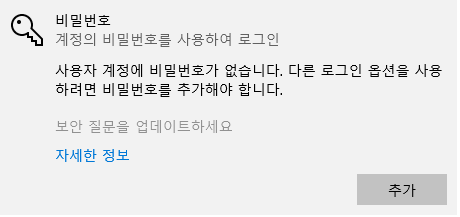 ● 비밀번호를 설정하지 않은 상태 : [추가] 버튼을 누르면 암호 만들기 화면이 나온다. 여기서 새 암호와 비밀번호 확인 및 암호 힌트를 기재하고 다음을 누르면 윈도우10 비밀번호가 설정된다.