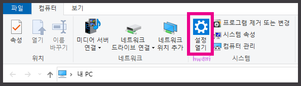 내PC 앱으로 들어오면 상단 메뉴에 톱니바퀴 모양과 함께 <설정 열기>가 보입니다. 해당 버튼을 눌러 설정을 열어주세요.