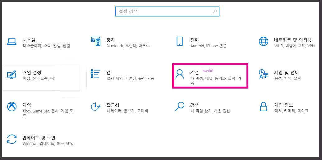 오늘은 윈도우10의 비밀번호를 설정하려고 하기 때문에 <계정>으로 들어갑니다. 계정에서는 내 계정, 메일, 동기화, 회사, 가족에 관한 사항을 설정할 수 있습니다.