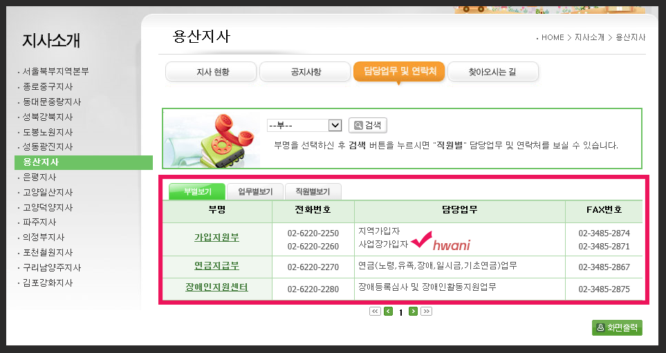 하지만, 지사의 전화번호는 보이지 않네요. 상단에서 찾아오시는 길 옆에 있는 <담당업무 및 연락처>를 누릅니다.