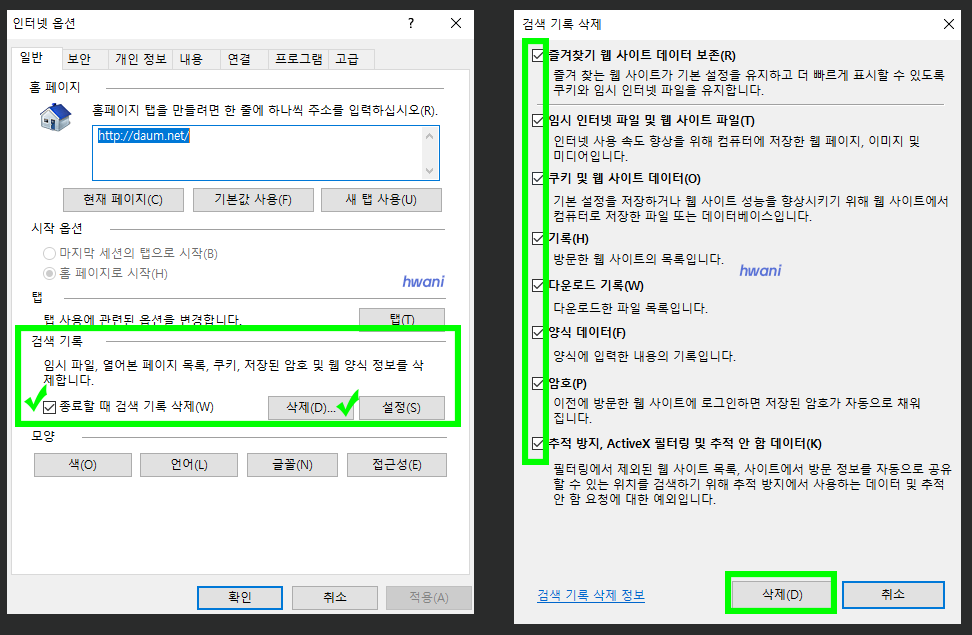 인터넷 옵션으로 들어오면 첫번째 탭에 일반이라고 되어있는데, 일반에서 검색기록을 보면 (임시 파일, 열어본 페이지 목록, 쿠키, 저장된 암호 및 웹 양식 정보를 삭제합니다.)라고 나와있다. 여기서 삭제 버튼과 설정 버튼이 있는데 삭제 버튼을 누르면 <검색 기록 삭제> 창이 뜬다. 여기서 체크박스에 삭제하고 싶은 내용들을 체크하고 하단에 삭제를 누르면 되는데, 즐겨 찾는 웹 사이트의 데이터까지 다 지우고 싶다면 첫 번째 박스는 빼고 나머지 체크박스에 표시하면 된다.
