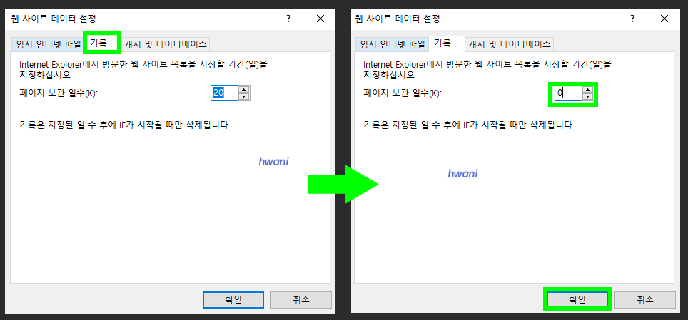 기록에서는 익스플로러에서 방문한 웹 사이트 목록을 저장할 기간(일)을 지정하라고 되어있다. 페이지 보관 일수가 0이 아닌 경우에는 0으로 바꿔두고 하단에 확인을 눌러주면 된다!