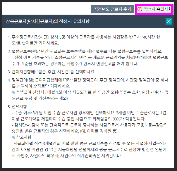 **그리고 입력 전 잘 모르겠다면 먼저 작성시 유의사항을 확인한다. 직전년도 근로자 추가 옆에 '작성시 유의사항'을 누르면 내용이 나온다.