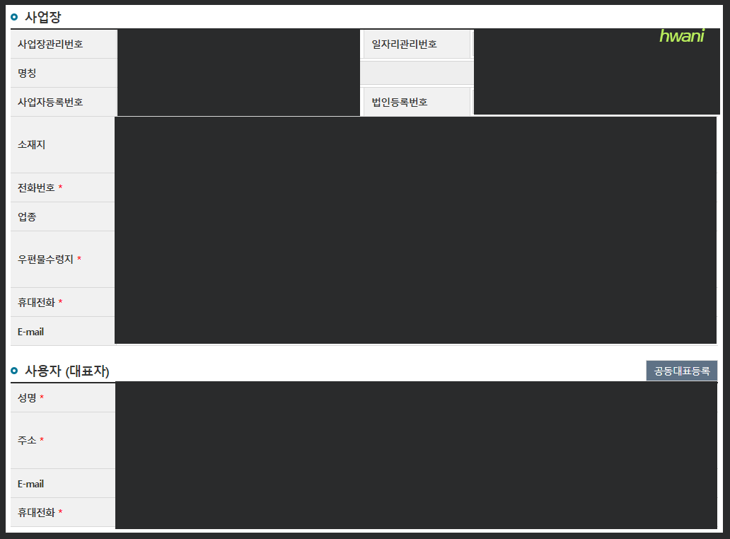 5. 사업장과 사용자(대표자) 정보 자동으로 입력되어 있음