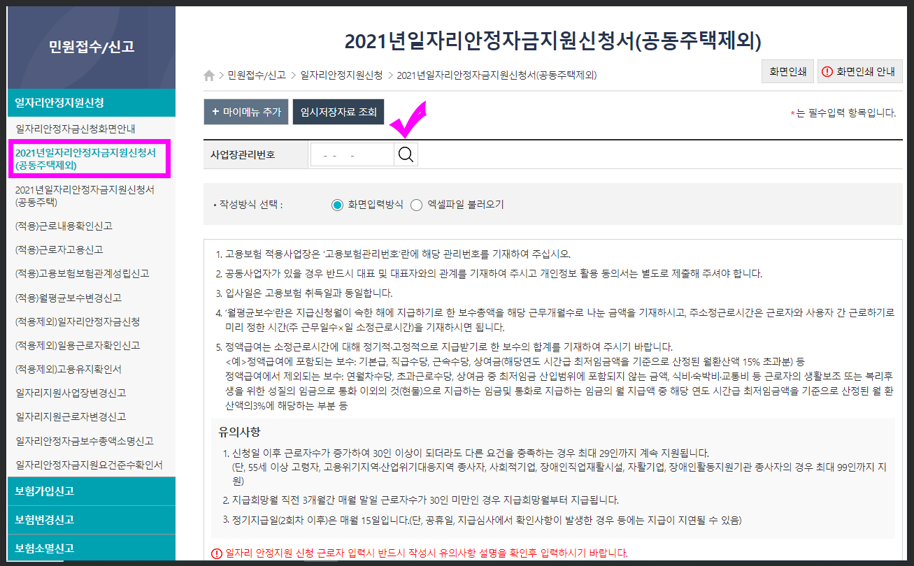 4. 일자리안정자금신청화면안내 → 왼쪽 메뉴에서 '2021년일자리안정자금지원신청서(공동주택제외)' → 사업장관리번호 오른쪽 돋보기