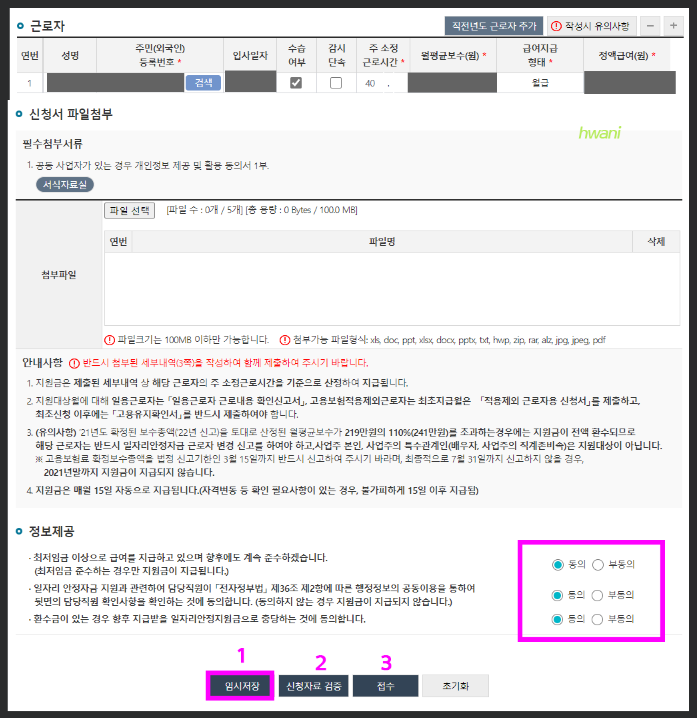 근로자정보를 모두 입력한 뒤에는 하단에 정보제공에 동의/부동의 체크를 해야한다. 모두 동의로 체크 후 '임시저장'을 누른다.
