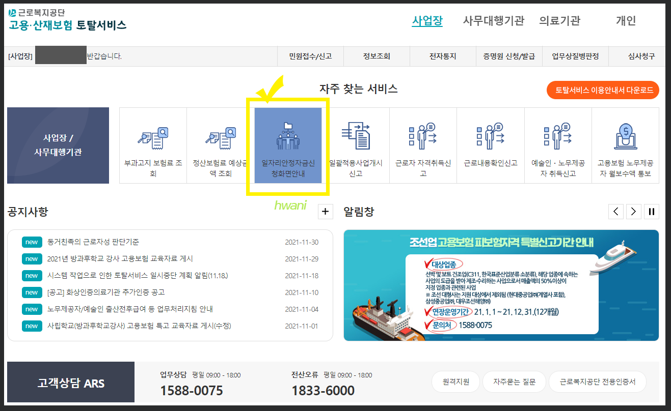 로그인을 하면 다시 메인화면으로 돌아오게 되는데 메인화면에서 '일자리 안정자금 신청화면 안내' 배너를 클릭한다.