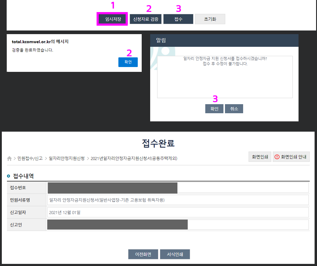8. 임시저장 → 신청자료 검증 → 접수 → 접수완료 화면 끝.