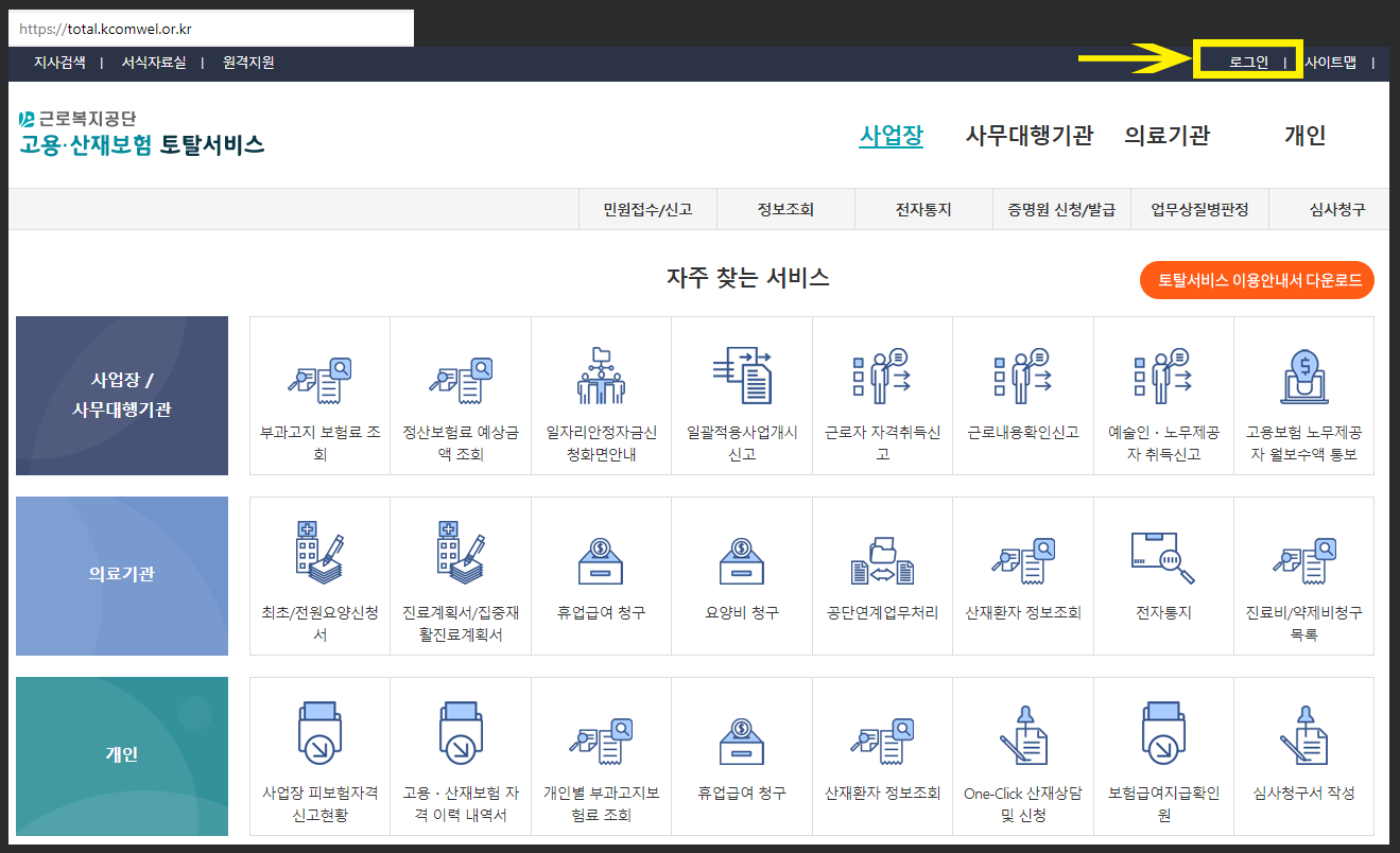 고용산재토탈서비스 홈페이지에 접속하여 로그인을 한다. (사업장 로그인 필요)