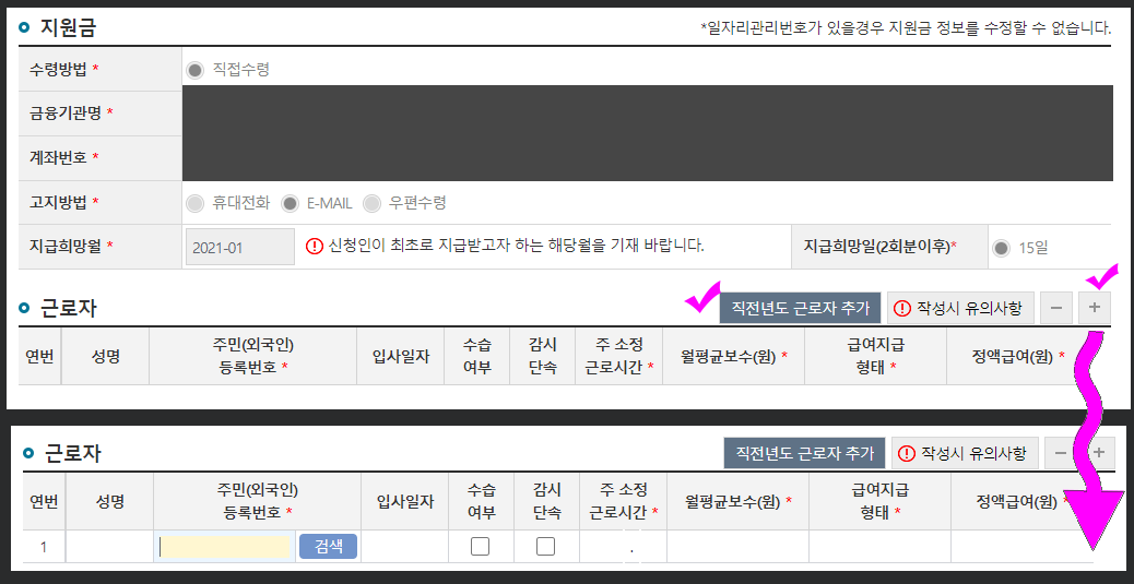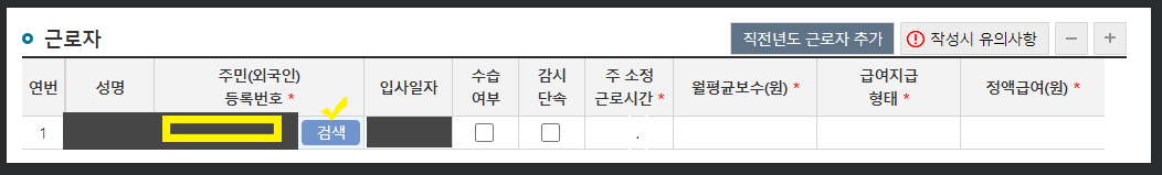 -직전년도 대상이었던 근로자를 신청하려는 것이라면 '직전년도 근로자 추가'를 누르면 된다. 하지만 신규직원을 신청하는 것이라면 오른쪽에 '+' 버튼을 누르면 하단에 입력란이 생성된다.
