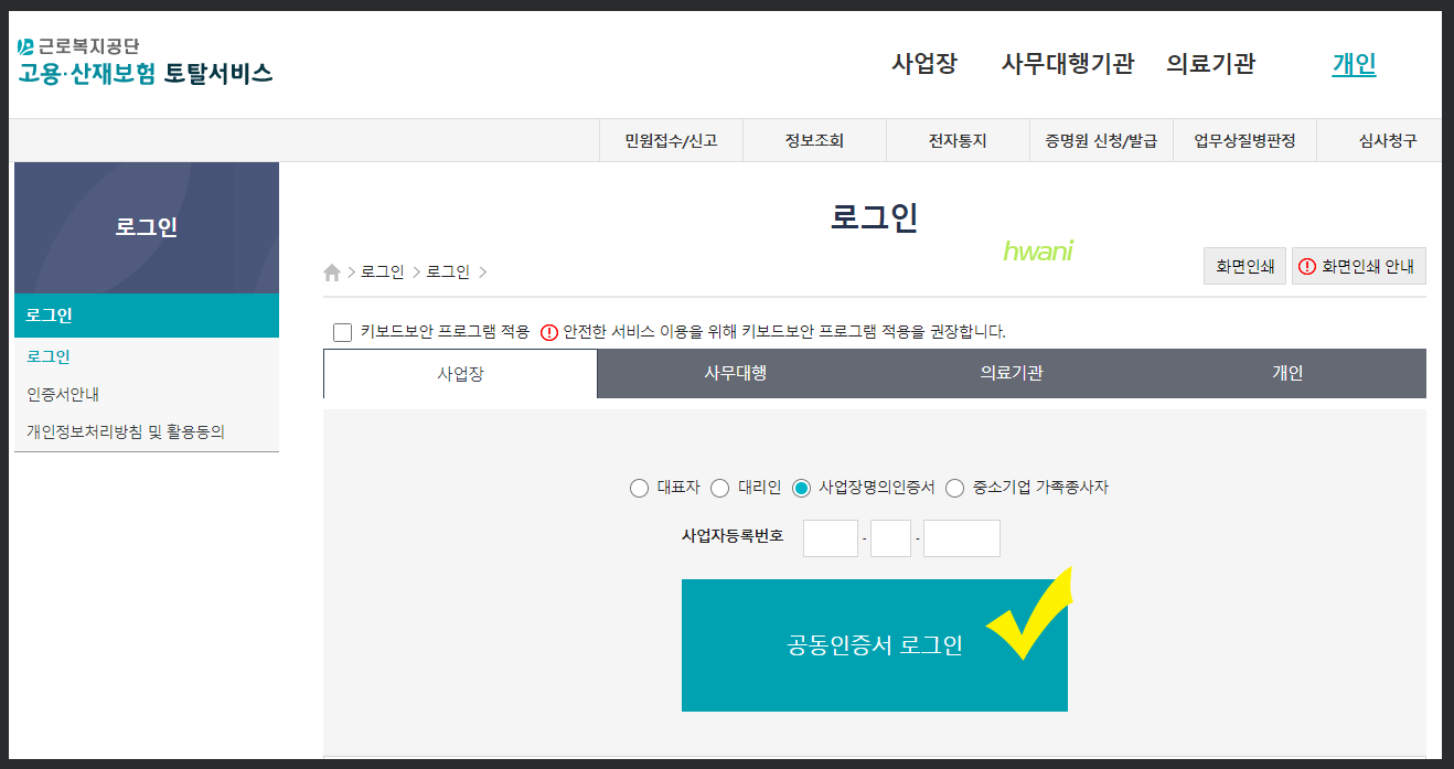 2. 로그인을 누른 뒤 '사업장' → 사업자등록번호 입력 후 공동인증서 로그인