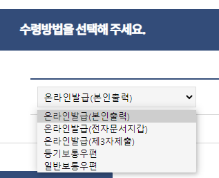 수령방법에는 총 5가지 방식으로 선택할 수 있습니다. 온라인 발급(본인 출력)/ 온라인 발급(전자문서 지갑)/ 온라인발급(제3자제출)/ 등기 보통우편/ 일반 보통우편으로 다양한 방법으로 수령이 가능하도록 해놓았습니다.
