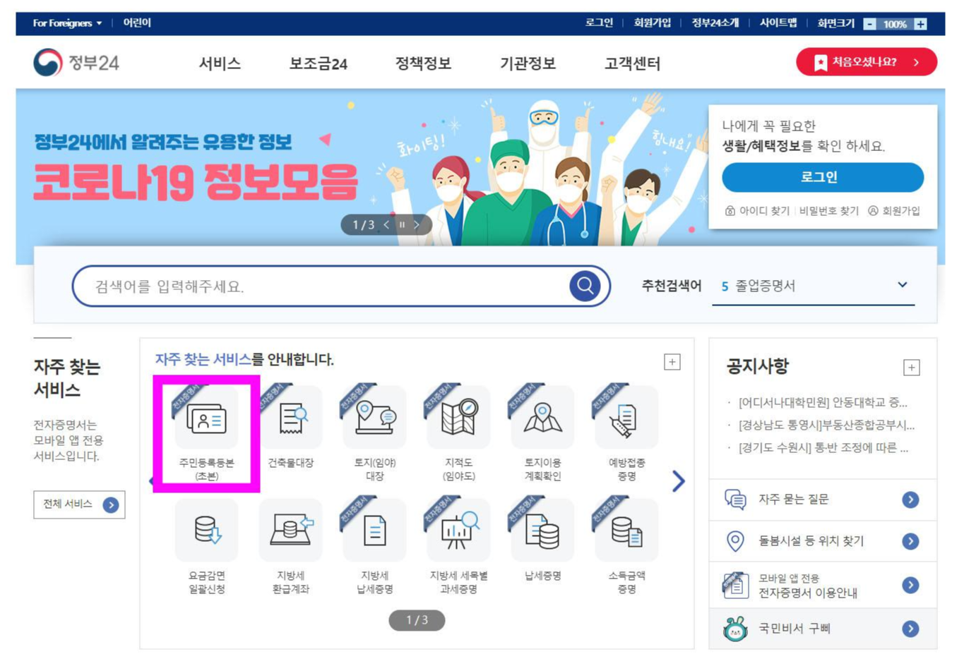 2. 메인화면에서 자주 찾는 서비스 - 주민등록등본(초본) 누르기