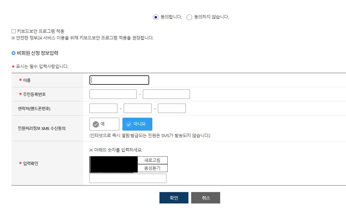 비회원으로 신청하면 개인정보 수집에 관한 사항과 고유식별정보 수집에 관한 사항을 각각 <동의합니다>로 체크해야 합니다. 그리고 비회원 신청 정보 입력란에 해당 정보를 입력해야 하는데 빨간색으로 별표* 처리가 되어있는 이름/ 주민등록번호/ 입력 확인에 관한 사항만 입력하면 됩니다.