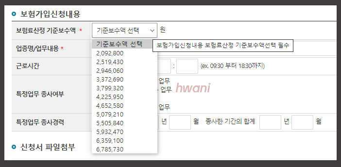 신청서에는 여러 항목이 있는데 이 중에서 실제로 선택하고 입력하는 부분은 <보험가입신청내용> 중에서 <보험료 산정 기준 보수액>을 선택하고 <업종명/업무내용>을 기재하는 것 말고는 특별히 없습니다.