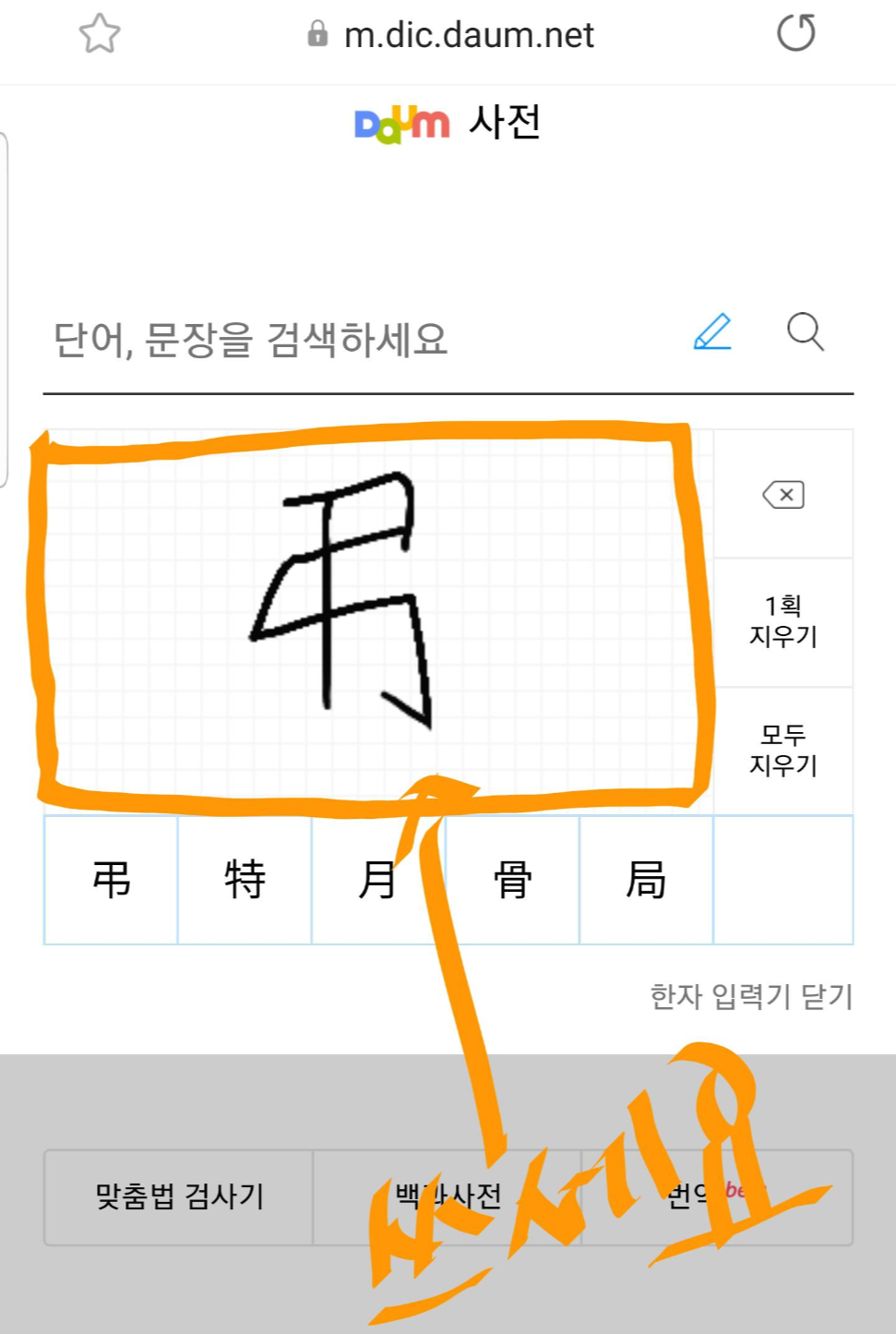 그렇다고 해도 한자를 아예 안 쓰는 건 아니잖아요. 어느 날 한자가 보여서 저건 뭐라고 읽는지 궁금해서 아빠한테 물어보니 포털사이트에서 제공하는 한자사전에서 손으로 한자를 써서 찾을 수 있다고 이야기해주셨습니다. (휴대폰으로 한자를 쉽게 찾을 수 있다니!)